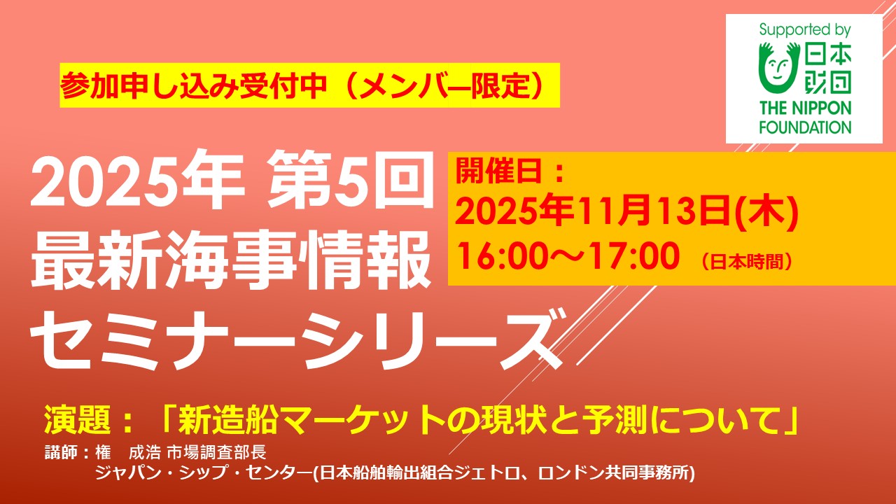 IMPORTANT NOTICE 【再配信動画を掲載しました】2024年第4回最新海事情報セミナーシリーズ Latest News 一覧を見る 分野別でみる 造船 舶用工業 海運 環境・安全 海洋開発・エネルギー 技術開発 各国政策・IMO 国・地域別でみる 中国・韓国 アジア・オセアニア 欧州 南北米州 中東・アフリカ 2025.10.31 Asia Marine News Maersk、Seatriumとの洋上風力設置船建造契約を突如解除通知 2025.10.31 Asia Marine News シンガポール、Keppel主導のコンソーシアムをジュロン島でのアンモニア発電・バンカリング事業に選定 2025.10.30 US Maritime News 米国船級協会(ABS)、沖合作業の安全性向上に資するデジタルツインソリューションを発表 2025.10.30 US Maritime News 米内務省、アラスカ北極圏沿岸部平野の石油・ガスリース再開を発表 2025.10.28 Asia Marine News インドの造船会社SDHI、4億8000万米ドルのインフラ投資を推進 Seminar 一覧を見る 2025年11月13日(木) 16:00〜17:00 (日本時間) 新造船マーケットの現状と予測について 2025年3月27日(木)10:30 ~ 11:30(日本時間) 米国の脱炭素化の動向について ~トランプ2.0の見通し(海洋・海事分野)~ 2025年3月21日(金) 15:00〜16:00 (日本時間) 造船分野の人材供給ポテンシャルについて 海外情報記事・調査報告書はこちら Euro maritime Info at a glance US Maritime News 中国海事通信 Asia Marine News Maritime Korea Annual reports 海事関係団体刊行物はこちら Shipbuilding in Japan SEA-Japan CAJS会報 JSMEA NEWS JSEA/日本船舶輸出組合輸出船契約実績 Introducing Partner Organizations 日本船舶技術研究協会 (JSTRA) (1) 日本船舶輸出組合 (JSEA) (2) 日本中小型造船工業会 (CAJS) (3) 日本舶用工業会 (JSMEA) 日本造船工業会 (SAJ)