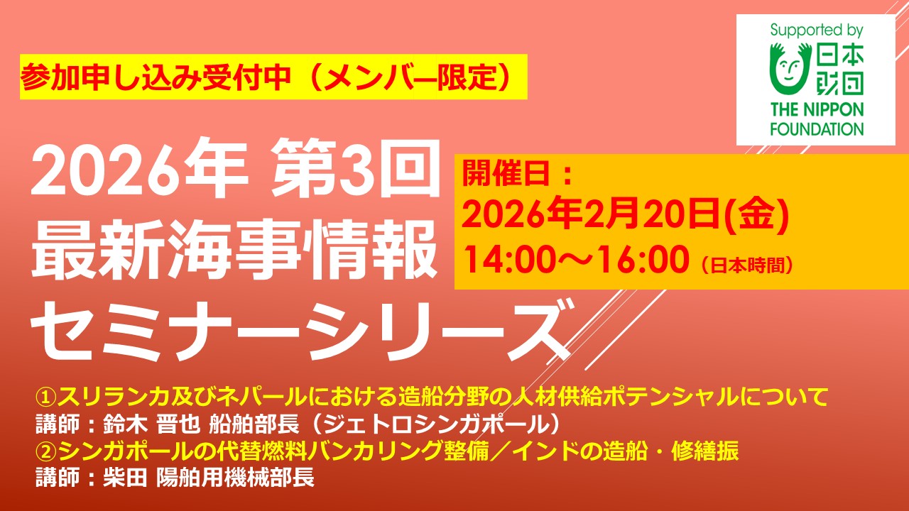 IMPORTANT NOTICE 【再配信動画を掲載しました】2024年第4回最新海事情報セミナーシリーズ Latest News 一覧を見る 分野別でみる 造船 舶用工業 海運 環境・安全 海洋開発・エネルギー 技術開発 各国政策・IMO 国・地域別でみる 中国・韓国 アジア・オセアニア 欧州 南北米州 中東・アフリカ 2026.02.12 US Maritime News 米労働省、造船業者などの負担軽減に向け、港湾労災保険の担保要件を明確化 2026.02.12 US Maritime News 仏プライベート・エクイティ企業、米造船企業(ヴィガー・マリーン)を買収 2026.02.12 Maritime Korea 全南開発公社、電気推進エコシップの試験施設を竣工 2026.02.12 Maritime Korea 産業通商部、昌原市で産業団地AXを本格化し、防衛産業・造船分野の製造競争力を強化 2026.02.12 Maritime Korea HD韓国造船海洋・HD現代重工業、「LNG 2026」でガス船技術力を披露 Seminar 一覧を見る 2026年1月30日(金) 16:00〜17:00 (本邦時間) 欧州における浮体式洋上風力及びそのサプライチェーンに係る政策とプロジェクト等の動向について 2026年1月28日(水)10:00 ~ 11:00(日本時間) 米国の造船、エネルギー政策の動向 2025年11月13日(木) 16:00〜17:00 (日本時間) 新造船マーケットの現状と予測について 海外情報記事・調査報告書はこちら Euro maritime Info at a glance US Maritime News 中国海事通信 Asia Marine News Maritime Korea Annual reports 海事関係団体刊行物はこちら Shipbuilding in Japan SEA-Japan CAJS会報 JSMEA NEWS JSEA/日本船舶輸出組合輸出船契約実績 Introducing Partner Organizations 日本船舶技術研究協会 (JSTRA) (1) 日本船舶輸出組合 (JSEA) (2) 日本中小型造船工業会 (CAJS) (3) 日本舶用工業会 (JSMEA) 日本造船工業会 (SAJ)